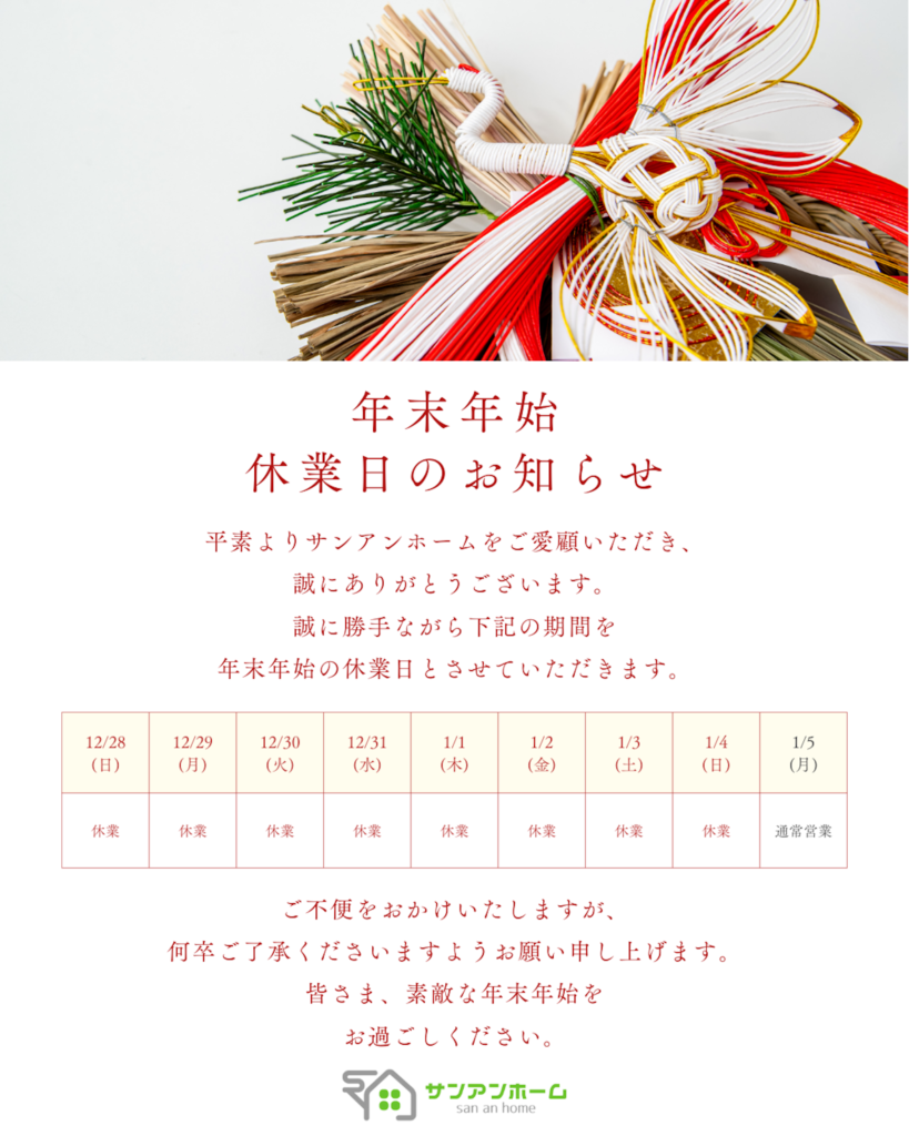 (株)サンアンホームでは、本年2025年の年末年始期間中の休業日を、下記のとおりとさせていただきます。